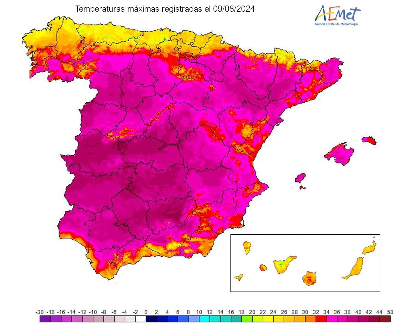 Entre los diez lugares con las temperaturas más altas del país, Castilla-La Mancha presenta tres. Oropesa (Toledo) con 42,8ºC; Almadén (Ciudad Real) 42,3ºC y Toledo con 41,5ºC.