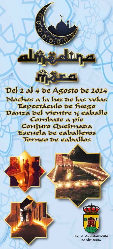 El primer fin de semana de agosto traerá cargada la agenda cultural en la comarca del Campo de Montiel. Es el caso de «Almedina Mora» que regresa con sus más de 20.000 velas iluminando el municipio. Las noches a la luz de las velas, los espectáculos de fuego, danza del vientre y a caballo, el conjuro de queimada y los torneos de caballeros son algunas de las actividades que se podrán disfrutar en esta localidad. Será del 2 al 4 de agosto.