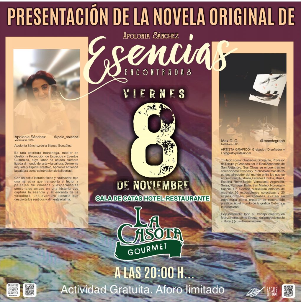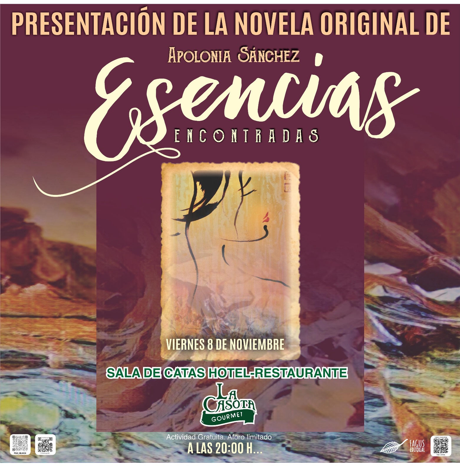 La escritora manchega Apolonia Sánchez de la Blanca presenta este viernes 8 de noviembre en La Solana su primera novela «Esencias Encontradas». Será a las 20:00 horas en la Sala de Catas del Hotel La Casota Gourmet con entrada libre.