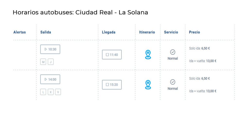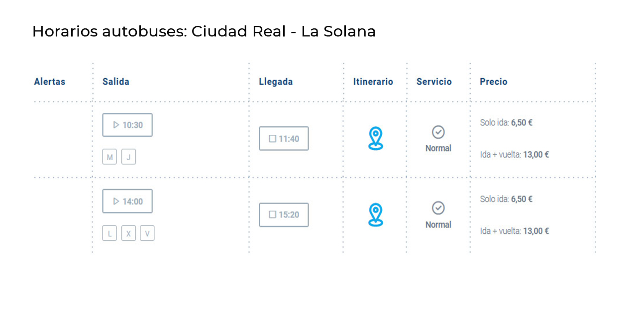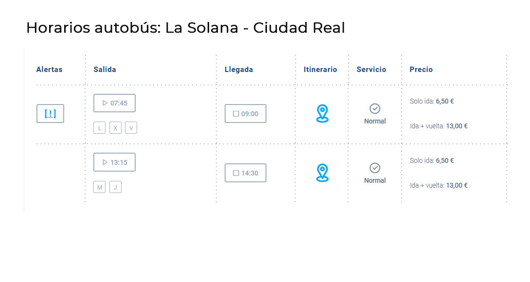 LaSolanaMedia no se hace responsable de los cambios, modificaciones o incidencias en los horarios que se indican. Únicamente se limita a trasladar la información que ofrece la empresa concesionaria del trayecto en su página web.