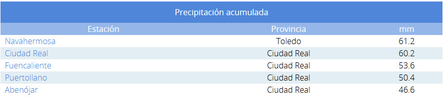 La borrasca Benerice ha dejado datos espectaculares en el oeste de la región. De hecho, el punto más lluvioso ha sido Navahermosa (en plenos Montes de Toledo) con 61,2 litros por metro cuadrado. Le siguen los ya mencionados de Ciudad Real con 60,2; Fuencaliente con 53,6; Puertollano con 50,4 y Abenójar con 46,6.
