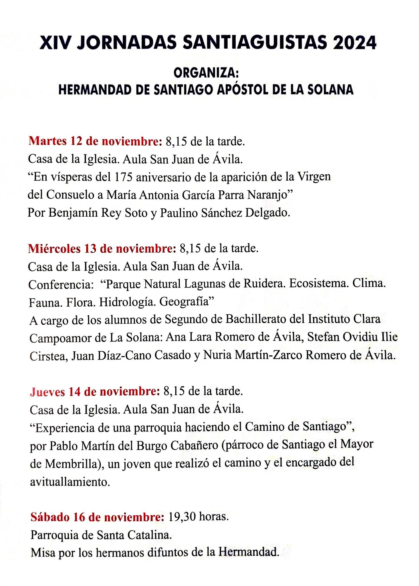 El jueves 14 de noviembre a las 20:15 horas la conferencia será «Experiencia de una parroquia haciendo el Camino de Santiago», por Pablo Martín del Burgo (párroco de Santiago el Mayor de Membrilla), un joven que realizó el camino y el encargado del avituallamiento.