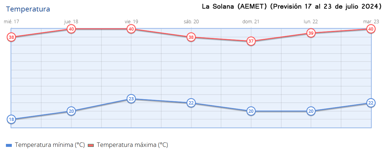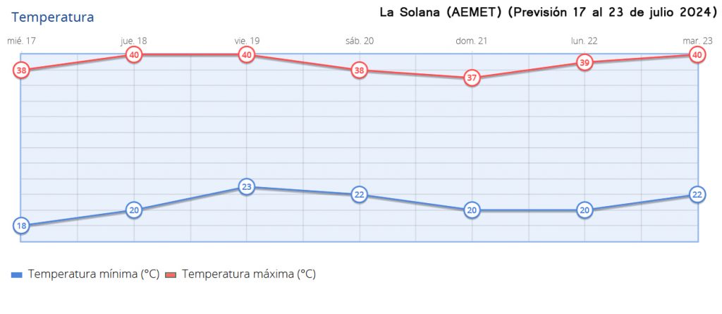 El calor llega a su cita a falta de una semana para la feria. Todo un clásico. En plena canícula (15 de julio al 15 de agosto) los termómetros volverán a alcanzar los valores máximos del año como es habitual. El responsable: un amplio anticiclón en niveles medios y altos situado en el interior de Argelia y que se extiende hacia el oeste induciendo flujo de componente sur que nos envía una masa de aire muy cálido y seco y estable, según ha detallado la AEMET.