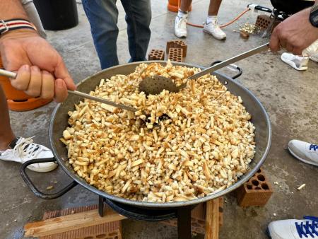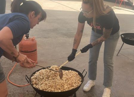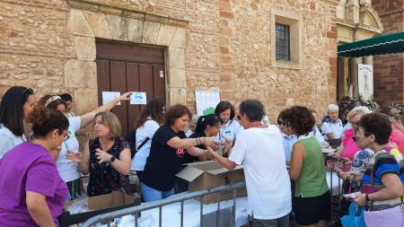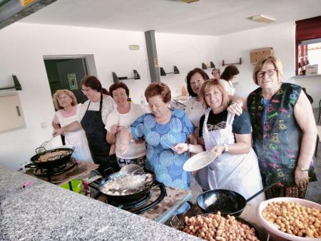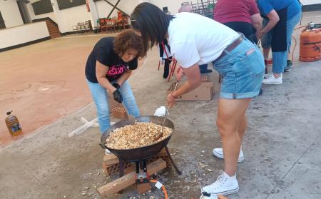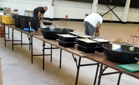 Sobre las dos menos cuarto se iniciaba el reparto de las raciones. Previamente, las personas habían adquirido las papeletas -al precio de cuatro euros- y con un destino solidario para dos colectivos: Alas de Papel y la Asociación Española de Cáncer de Mama Metastásico.