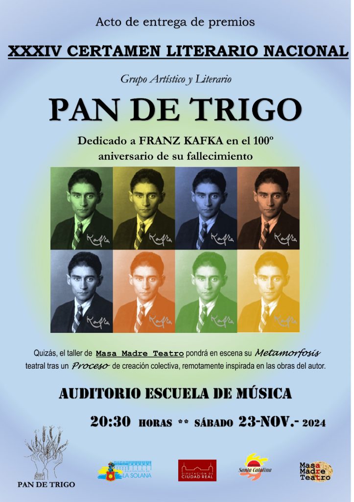 El grupo artístico y literario «Pan de Trigo» celebrará el próximo sábado 23 de noviembre el acto de entrega de premios de su XXXIV certamen literario nacional. Será en el Auditorio de la Escuela de Música a partir de las 20:30 horas. Según informa el grupo estará dedicado a Franz Kafka en el centenario de su fallecimiento.