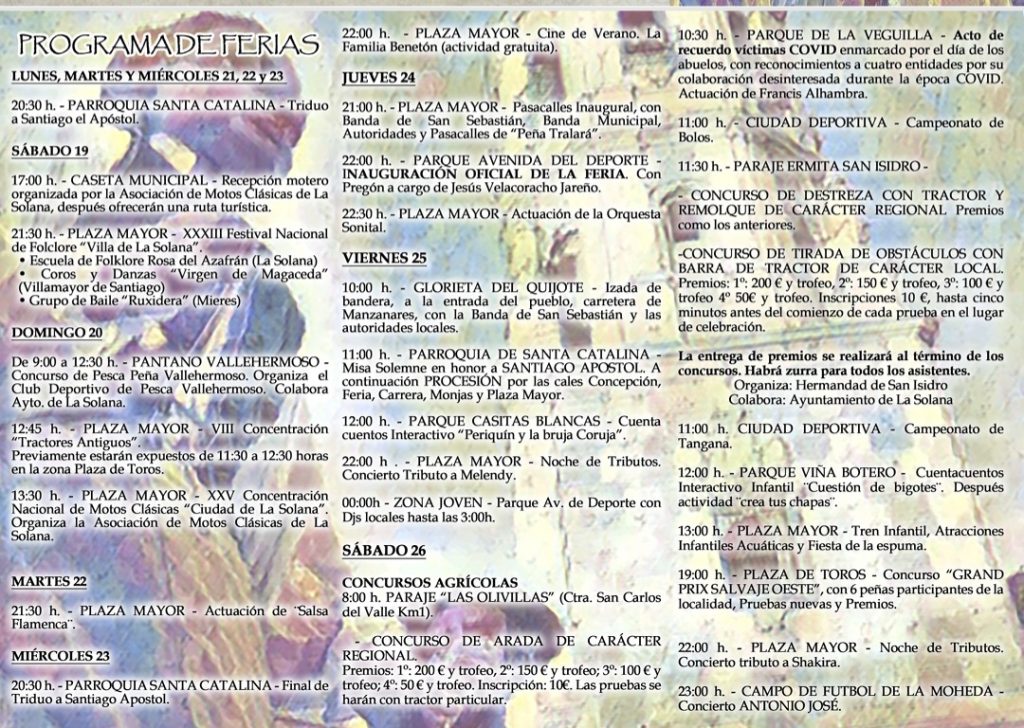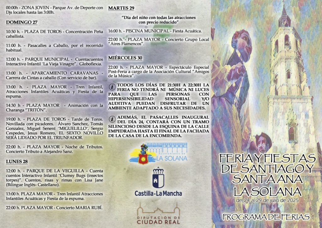 La Solana vivirá su tradicional Feria y Fiestas de Santiago y Santa Ana 2025 entre el 24 y el 29 de julio. Las fiestas arrancarán oficialmente con el pasacalles de gigantes y cabezudos y el corte de cinta. Seguidamente el pregón a las 22.00horas en el Parque de la Avenida del Deporte. El programa incluye las siguientes actividades.
