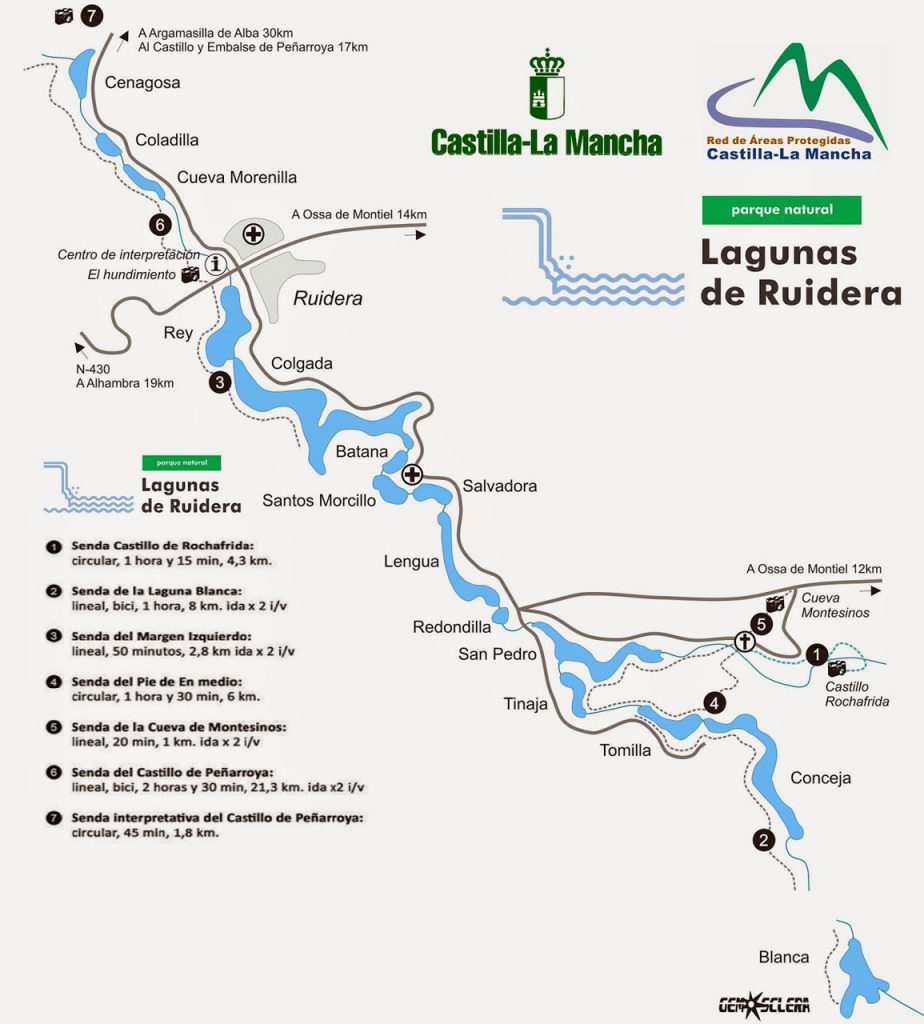 La peculiaridad del Parque Natural reside en el desnivel que existe entre la Laguna Blanca (870 metros) hasta los 730 metros del Embalse de Peñarroya. En medio, como se puede observar en la infografía de Federico J. García Mariana, el parque se divide en tres tramos: Lagunas altas (Blanca, Conceja, Tomilla y Tinaja); Lagunas de la cuenca media (San Pedro, Redondilla, Lengua, Salvadora, Santos Morcillo, Batana y Colgada) y las Lagunas de la Cuenca Baja (Del Rey, Cueva de la Morenilla, Coladilla y Cenagosa).