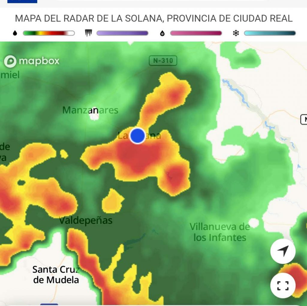 El fuerte calor se ha convertido apenas dos horas después en una lluvia bastante intensa por momentos precipitando durante más de 45 minutos. El frente tormentoso ha barrido la provincia de Ciudad Real dejando cantidades tan dispares que oscilan entre los 8 litros de Viso del Marqués hasta los casi 16 de Tomelloso. En La Solana, los datos consultados a MeteoFuente hablan de cantidades que oscilarían (según las zonas del municipio) entre los 6,5 y los 10 litros de lluvia. La imagen que acompañamos en esta crónica (The Weather Channel) muestra el paso de la lluvia sobre la localidad.