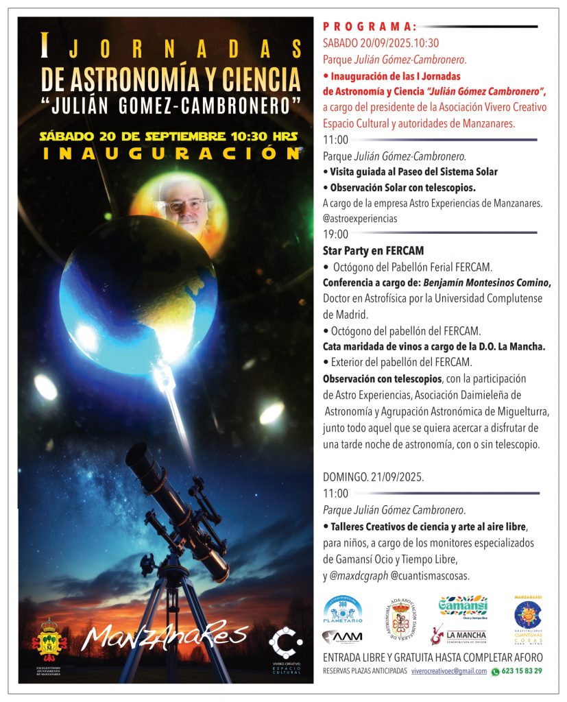 El Ayuntamiento de Manzanares y la Asociación Vivero Creativo Espacio Cultural han organizado las I Jornadas de Astronomía y Ciencia “Julián Gómez-Cambronero”. Un evento cultural y divulgativo que pretende acercar la ciencia y la astronomía a la ciudadanía, rindiendo homenaje a la memoria del Dr. Julián Gómez-Cambronero, prestigioso investigador manzanareño.